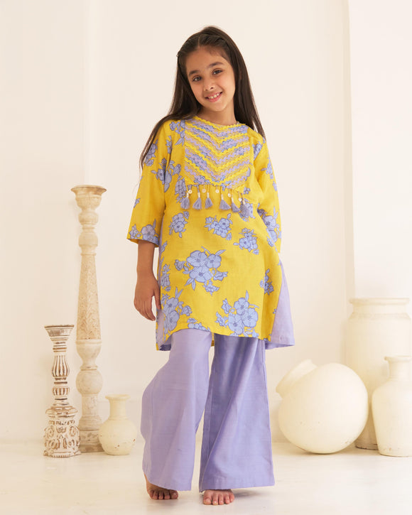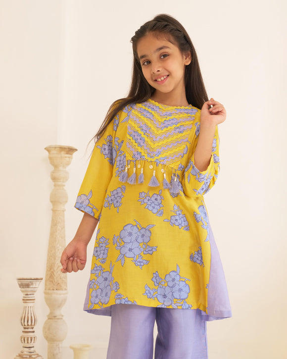 PRINTED KURTA EMBROIDERD YOKE WITH TASSEL DETAILING WITH TULIP PANT